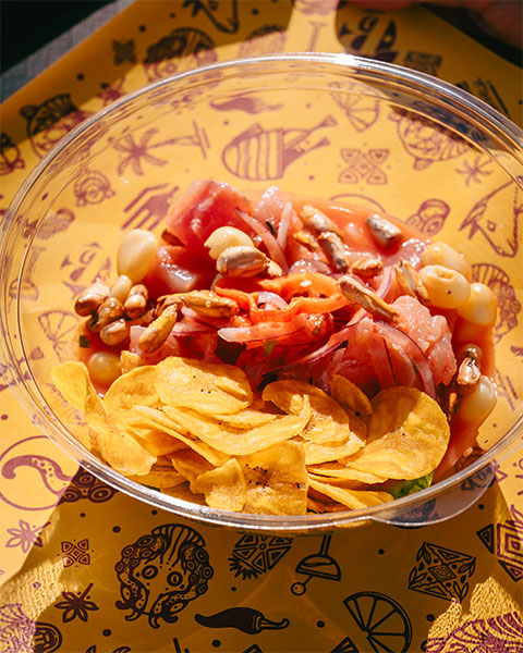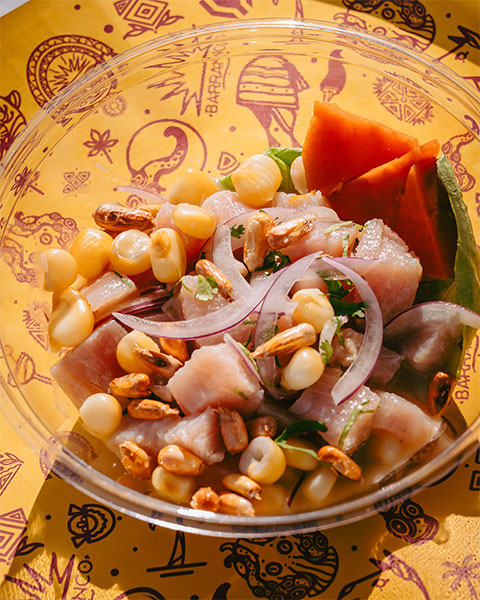 Mahi-mahi frais, leche de tigre, choclo, cancha, patate douce.
