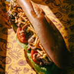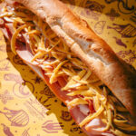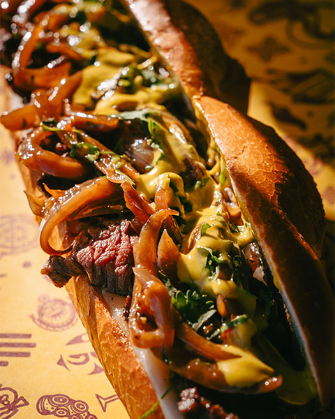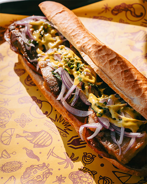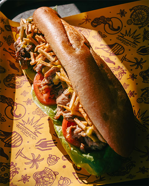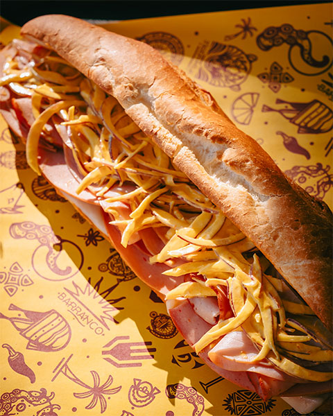Assortiment de mortadelle, jambon fumé et capicollo, Monterey Jack, laitue, oignons rouges et mayo à l’ají amarillo.