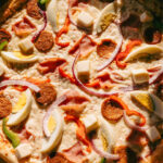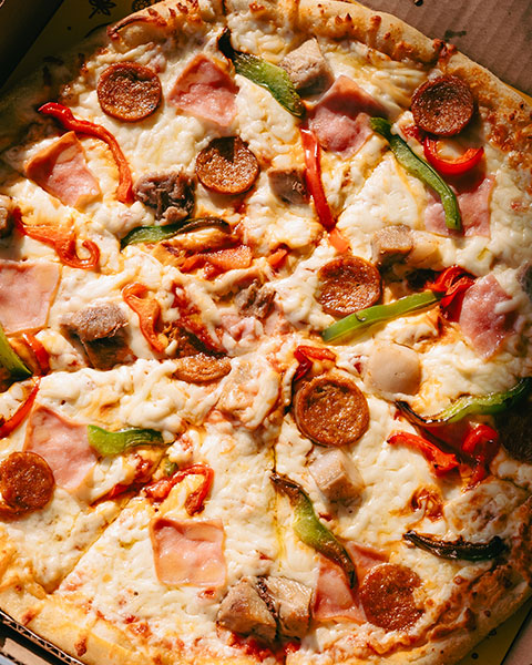 Bacon, jambon fumé, chorizo, poivron rouge, champignons, oignons rouges, mozzarella et sauce tomate.