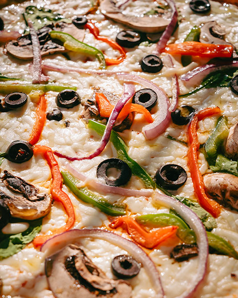Champignons, olives noires, poivrons rouges, jeunes pousses d’épinards, mozzarella et sauce tomate.