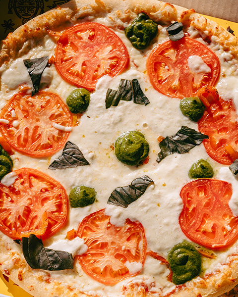 Basilic, sauce tomate, pesto péruvien, ají amarillo et mozzarella fraîche.