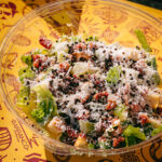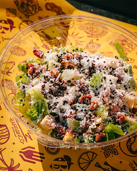 Laitue romaine, parmesan, croûtons, éclats de bacon, quinoa frit et vinaigrette César au huacatay.