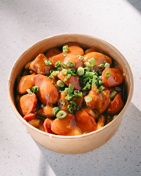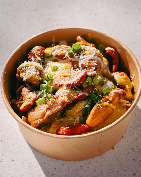Frites, sauce à poutine, fromage en grains, saucisse Frankfurter et oignons verts.